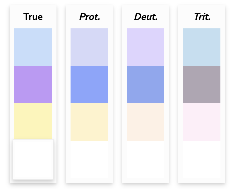 The following example color palette uses a few ILF-flavored colors as the True colors and shows how these colors will appear to someone with colorblindness (depending on the type).